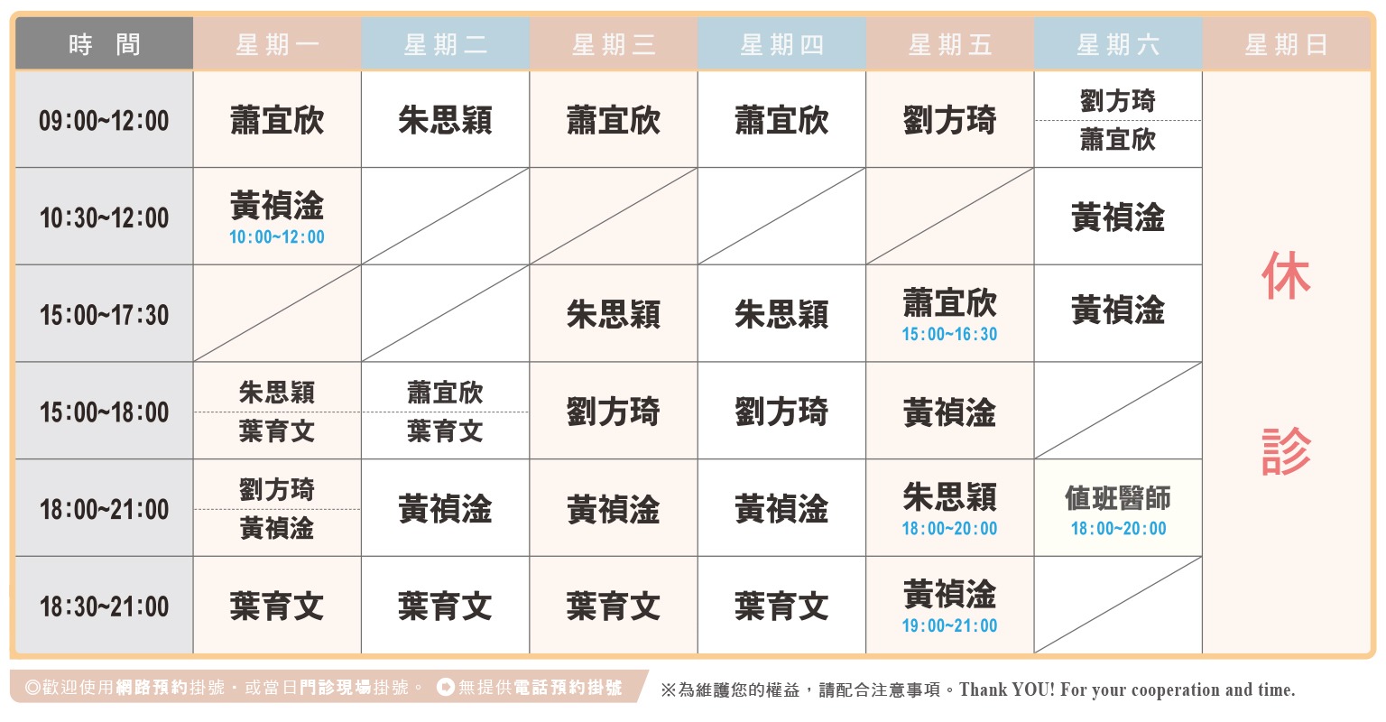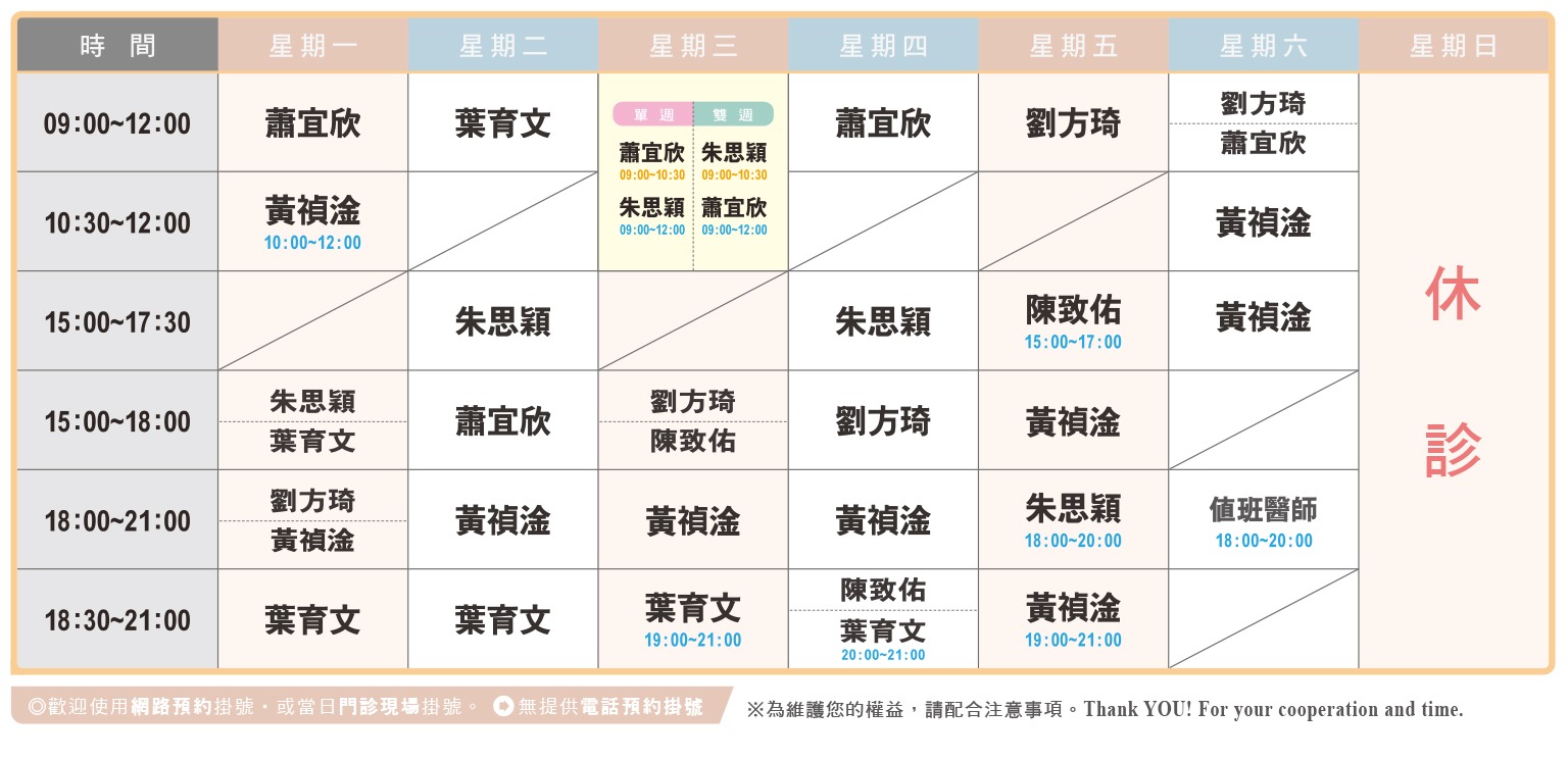 114年10月起每周一二三四五門診看診至21:00,不指定醫師無預約者請20:00前至櫃台掛號,請有預約者務必在預約的醫生看診時段下診前一小時至櫃台掛號報到。(超過時間視情況停掛)。